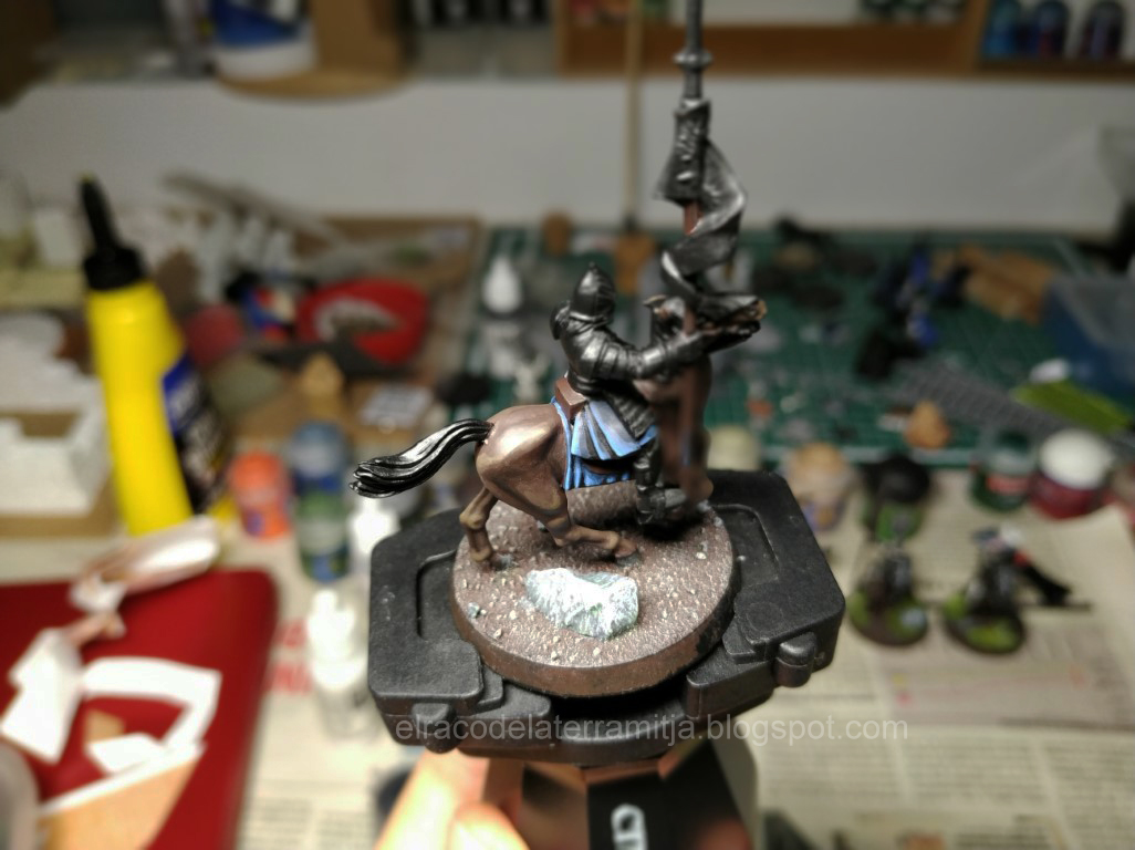 Pongo fotos de los avances en pintura que he hecho con el caballero de Minas Tirith para presentar en el Mastermini. No sabia si pintar los ropajes de color azul como tengo la infantería o dejarlos en negro como el resto de caballeros que tengo.